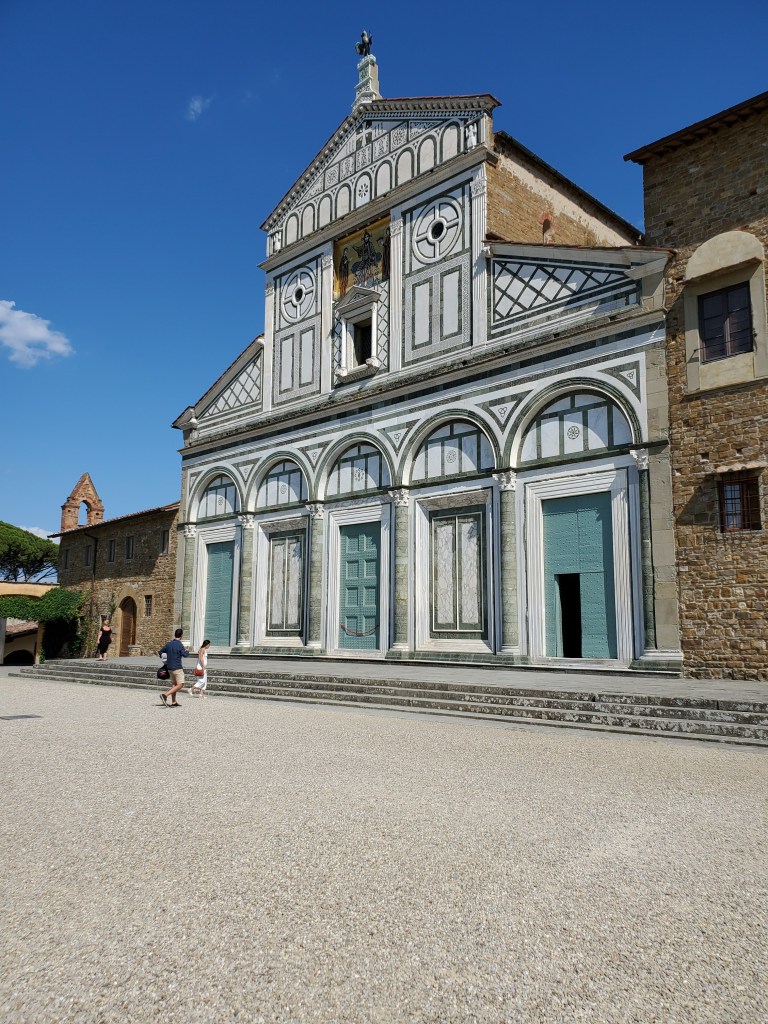 San Miniato Al Monte basilica, was my first researched tour and is located very close to the famous Piazzale Michelangelo. This year the church turned a thousand years old! It is located atop one of the highest points in Florence with a reputation as being one of the most scenic views in Italy. The day before I planned to see this church, I was told by several of my Florentine friends to take a bus or taxi because walking would be difficult due to the distance from my apartment. Additionally, there are many steps to climb leading up to this attraction. However, I challenged myself into braving the walk from my apartment since Google maps showed the walking distance to be a half hour. Even though it was a very hot day, walking turned out to be a good choice for me and as I approached my destination, I noticed quite a few helpful street signs pointing out the direction of both San Minato and Piazzale Michelangelo. When I finally reached the cascade of wide steps and ascended to the top, I exclaimed to an artist seated on the steps with his paintings for sale, “Ho fatto!” (I did it He responded by lightly slapping my hand with a high five and cheery “Fantastico!”