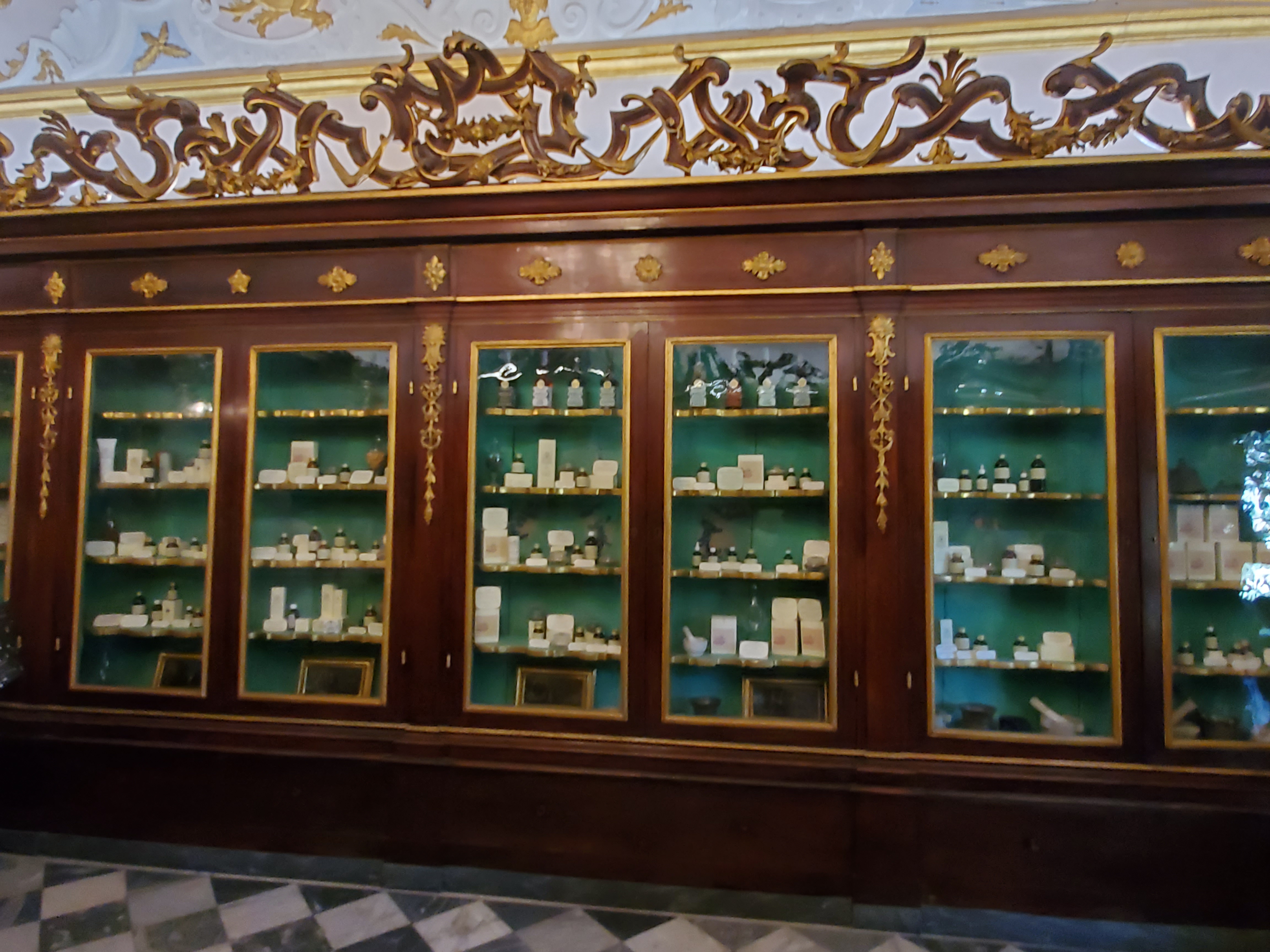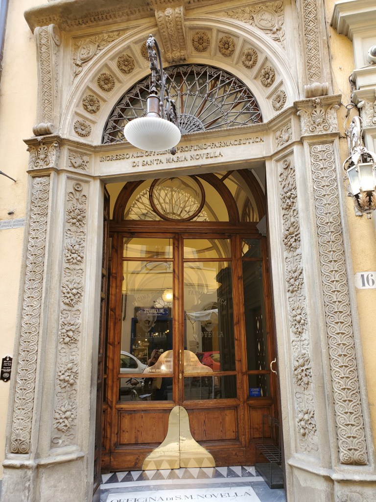 The Santa Maria Novella perfumery-pharmacy is one of the oldest pharmacies in the world ( about 600 years old). It is a place that many visitors do not get a chance to see. It took me a while to find, even after I asked several employees inside the Santa Maria Novella train station. Finally, after taking a long walk through the mall in the train station and following the directions of a cigar shop employee (Walk straight (“dritto”), then turn right (“a destra”), walk a bit and then turn left (“a sinistra”), I almost walked right past the sign above the doorway. It seemed to blend in with the other businesses on a side street. I couldn’t believe I found it!