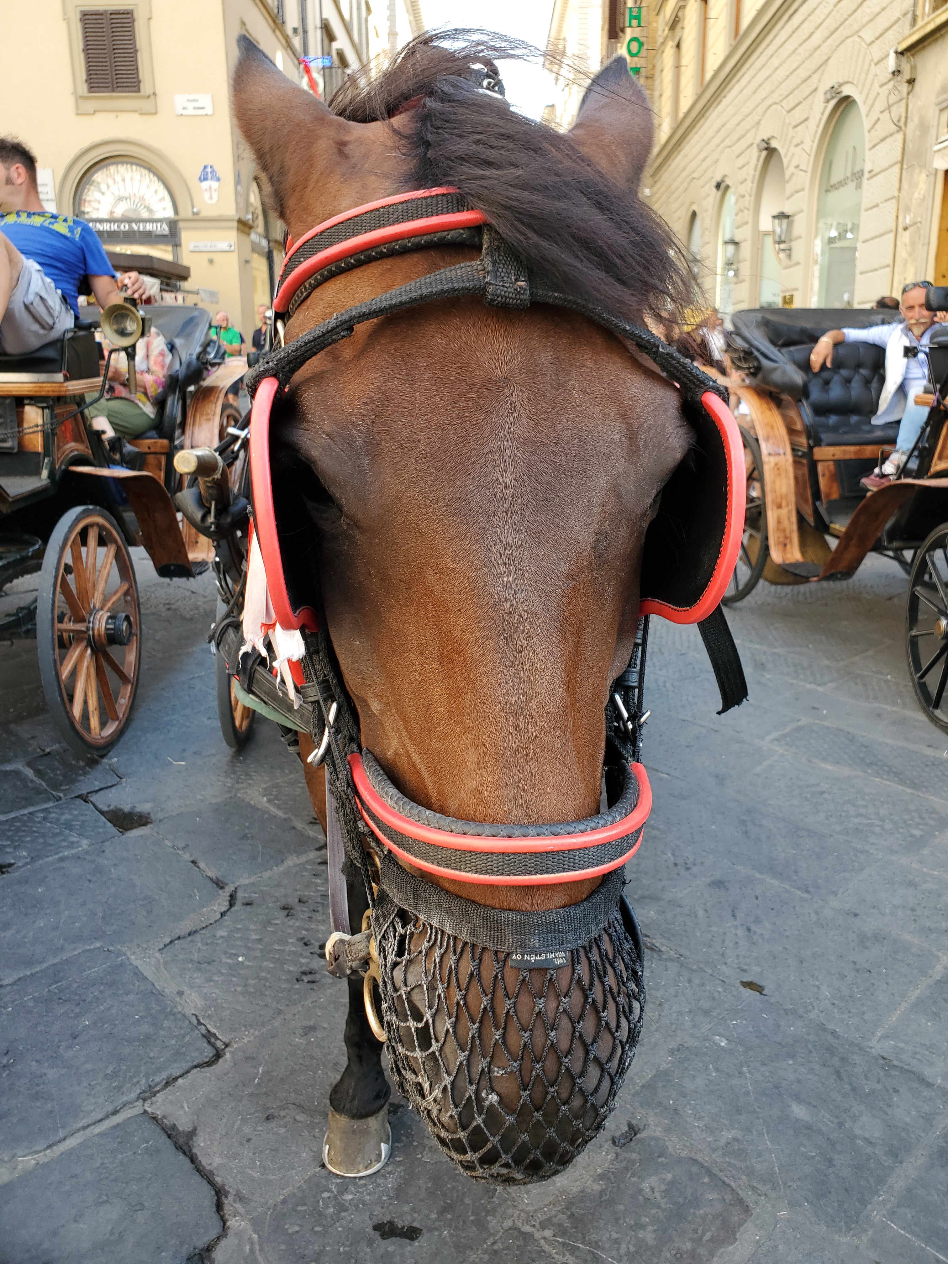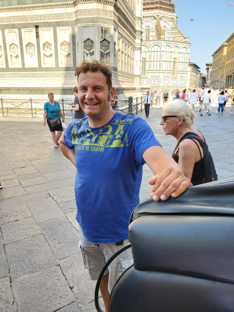 During my previous visits to Florence I felt a bit envious of the couples and families smiling as they rode horse drawn carriages through the streets of one of my favorite cities! A few of my Florentine friends had told me it was just a cheeky tourist attraction and not worth the 50 euros. Thus, foolishly, for the last five years, I talked myself out of my yearning to experience this excursion. This year I was determined to ignore the negativity stuck in my head! So, on a warm, slightly cloudy day, I walked to the Duomo/Giotto’s Tower area, part of the main amazing historical attraction that marks the center of this city, and stared momentarily at a group of horses taking a break near their carriages. I took a deep breath, cleared my mind, and walked over to one of the drivers or fiaccherai (singular is fiacchero) as they are called in Florence, to request a ride.