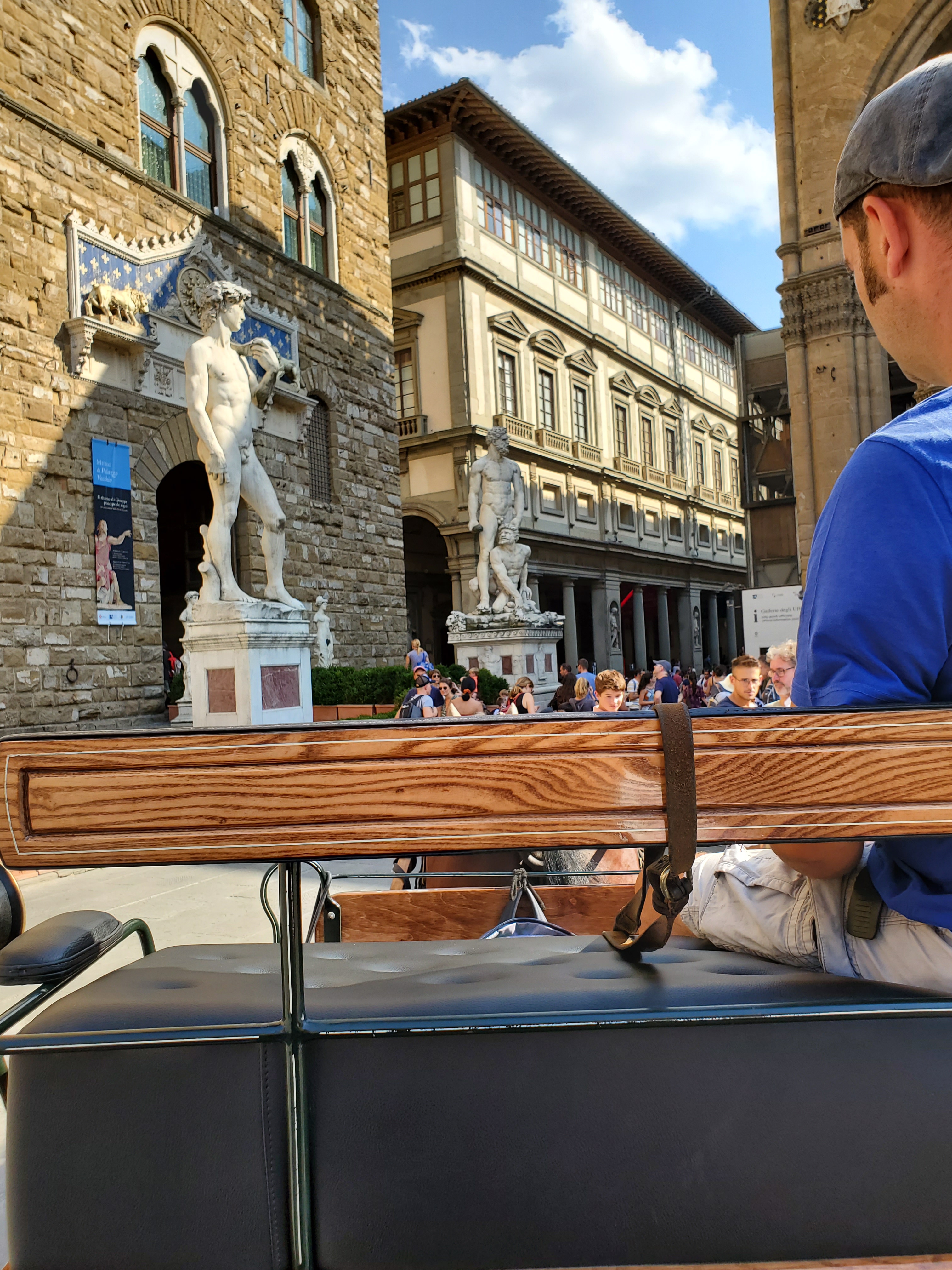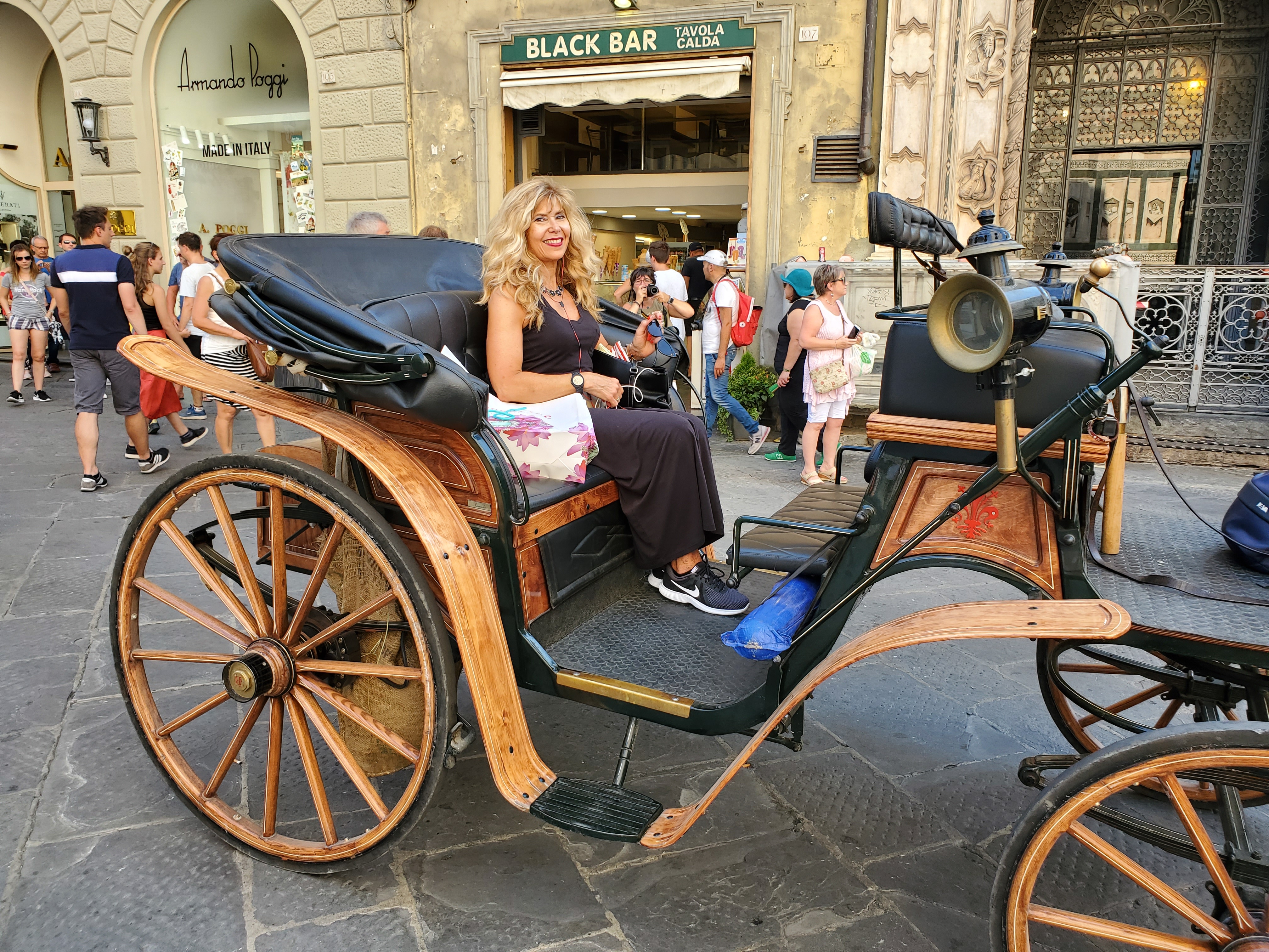 I decided to choose a driver who was sitting comfortably in a carriage while his horse was eating. Other drivers were conversing happily with each other. As I spoke in my labored Italian (with an obvious American accent) to this happy fellow, a broad grin broke out on on his face. He introduced himself as Cristiano and assisted me onto a comfortable leather seat in his carriage. While he expertly maneuvered the carriage through the crowds, Cristiano proudly told me about his job and family. I even learned that his horse, “Giotto,” was named after the famous Giotto’s Bell Tower located near the Duomo. To me it was worth the 50 euros to ride like a princess and enjoy this lovely city in a more relaxed manner instead of a sitting on a crowded tour bus. I didn’t feel the least bit nervous or uncomfortable to be riding alone. Cristiano gave me his own tour through many side streets in the city and along the Arno River. I remember wishing for the ride to be longer than a half hour!