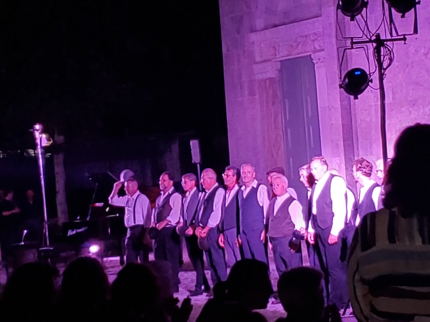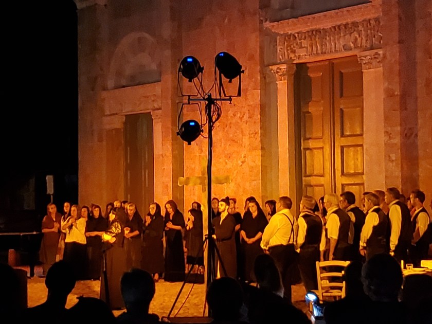 When I arrived at the front of the church there were at least two hundred people in the audience seated outside in white chairs. I had no trouble finding a seat. The beauty of the lit-up church was hypnotic. There was a full cast and musical accompaniment by a talented pianist and electronic organist. I was mesmerized by the spectacular voices of these singers! I felt like the luckiest person in the world and honored to attend a free show with such unbelievable talent.