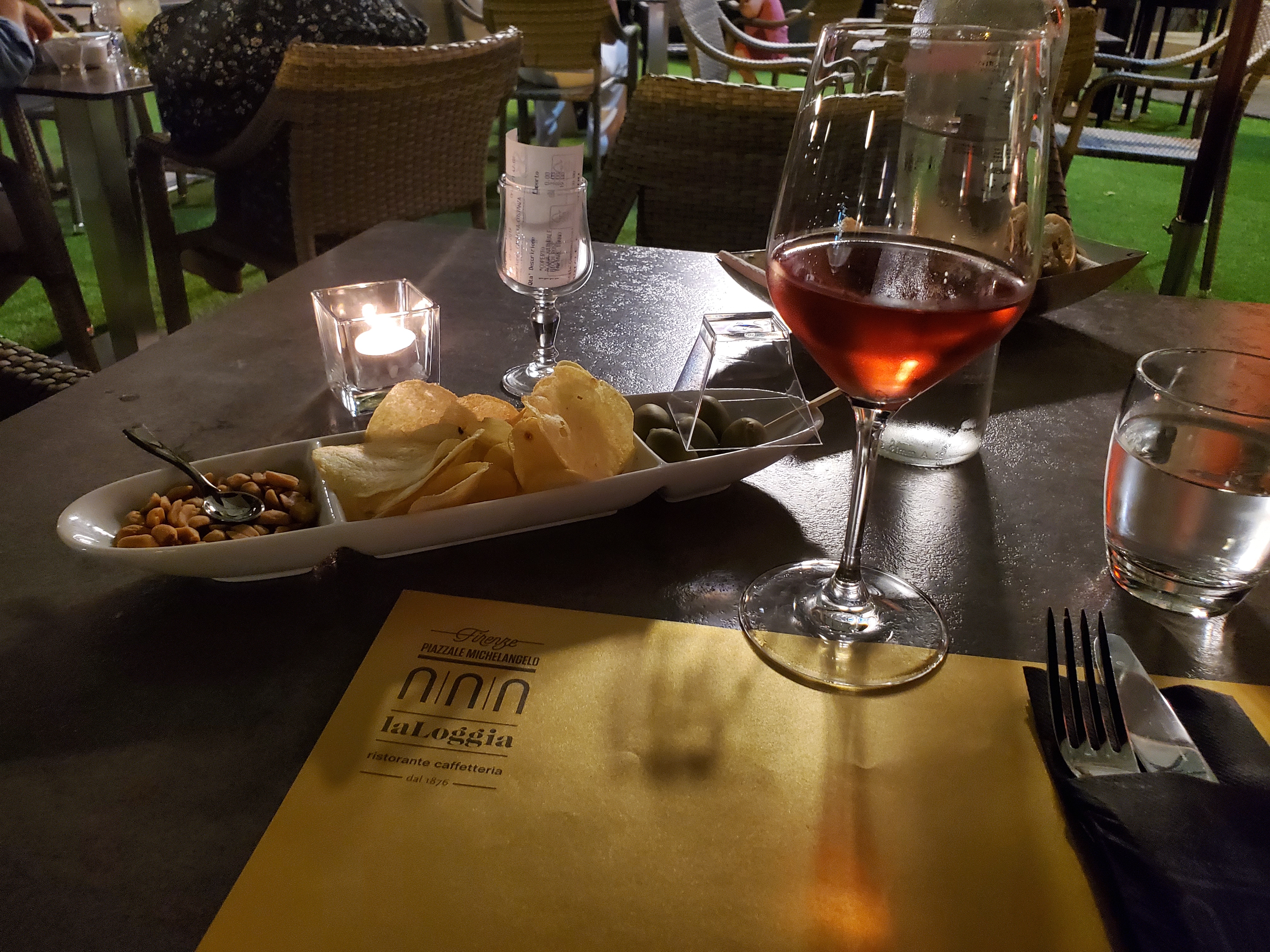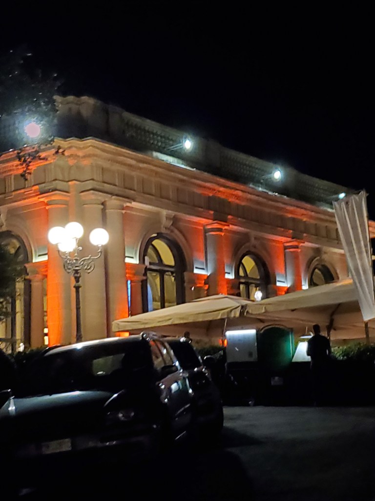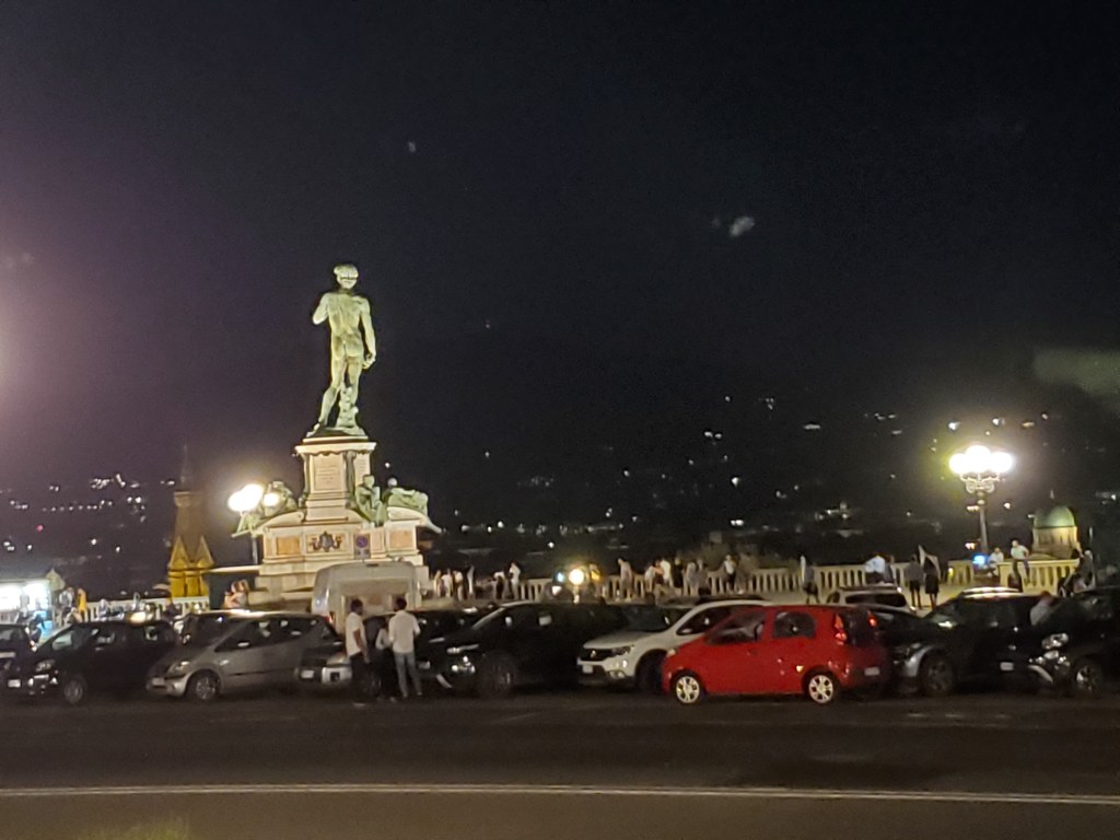 As I got out of the taxi, I saw a restaurant with large street lights located practically across the street from the night club. Since I hadn’t eaten dinner yet I walked up to what appeared to be a well lit outdoor dining area in front of a building resembling a museum. La Loggia del Piazzale Michelangelo is an upscale restaurant well known to the locals and it sits directly across from the Piazzale Michelangelo square with a spectacular view of Florence. This posh restaurant has been at it’s current location for many years. Many people come here for dinner or just to have an apertivo (Italian name for a before dinner drink) with tasty appetizers. For more information on this lovely restaurant and a colorful photographic video, follow this link: https://loggiapiazzalemichelangelo.com/