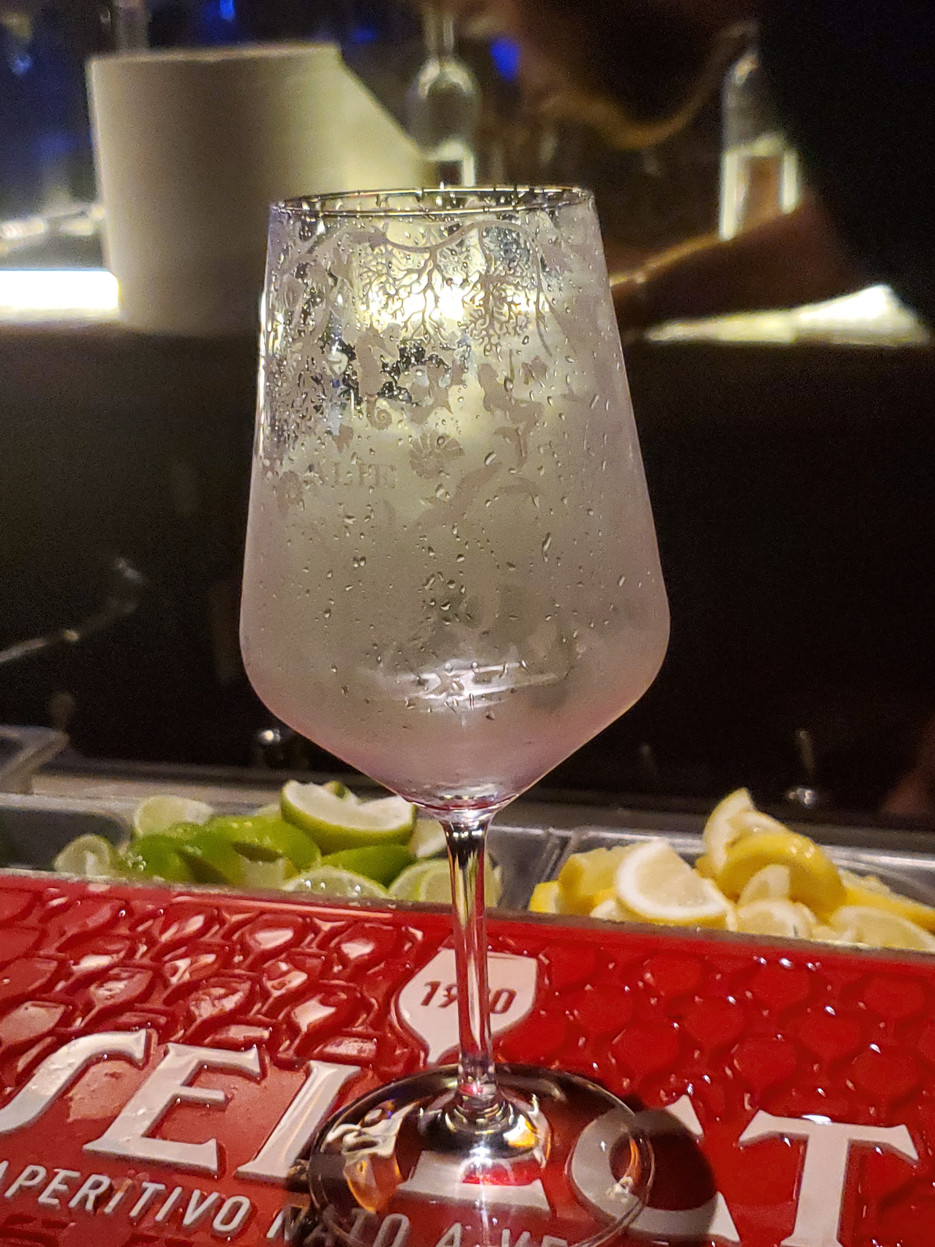 Then I thought, why not get a glass of wine first? Well, I was completely caught off guard when the bar tender told me I had to pay and get a ticket for my wine from a separate booth first. I returned with the ticket and watched the bartender poor shaved ice into a pretty glass decorated with a frosted white pattern. He proceeded to shake out the ice and then filled the glass with wine!
