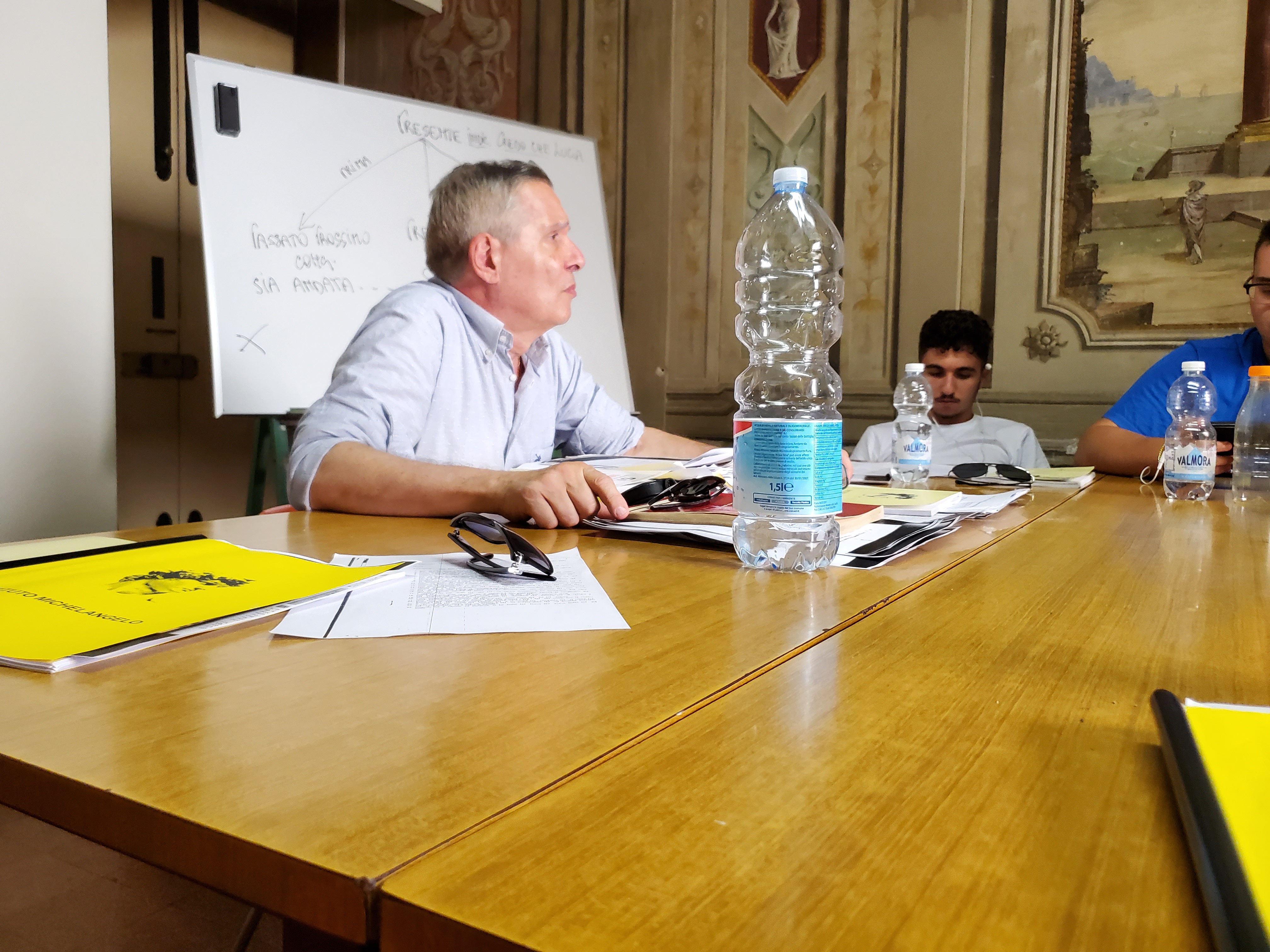 Lapo, the efficient secretary, meeting with students on the first day of a school session. (Behind Lapo is a screen displaying a photo of the director/owner of the institute, Domenico Cancellieri.)