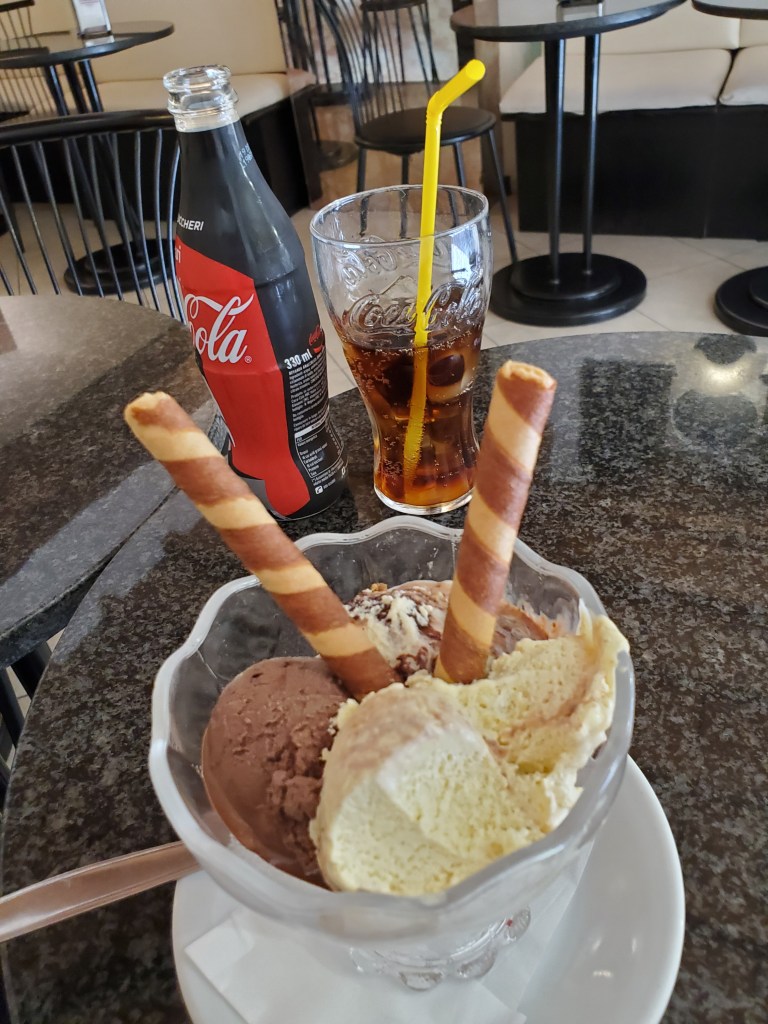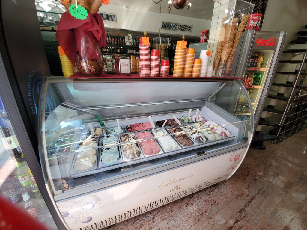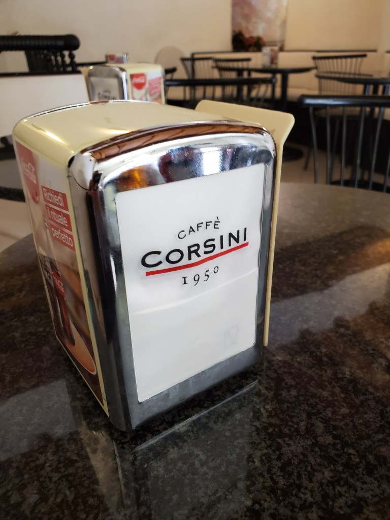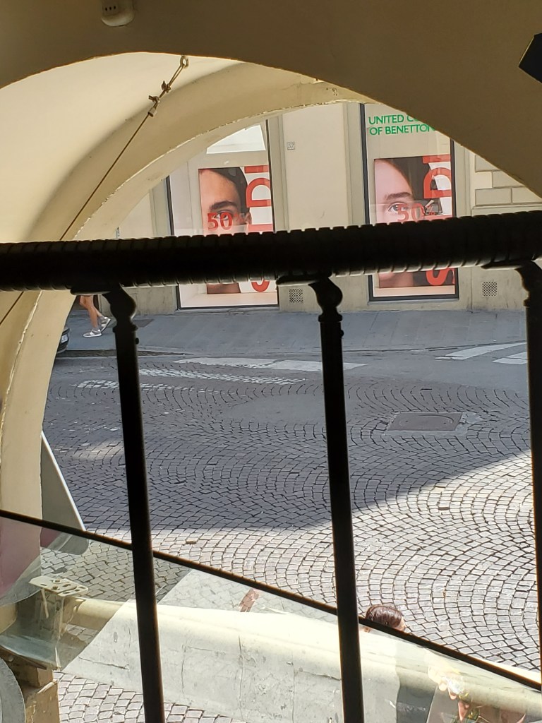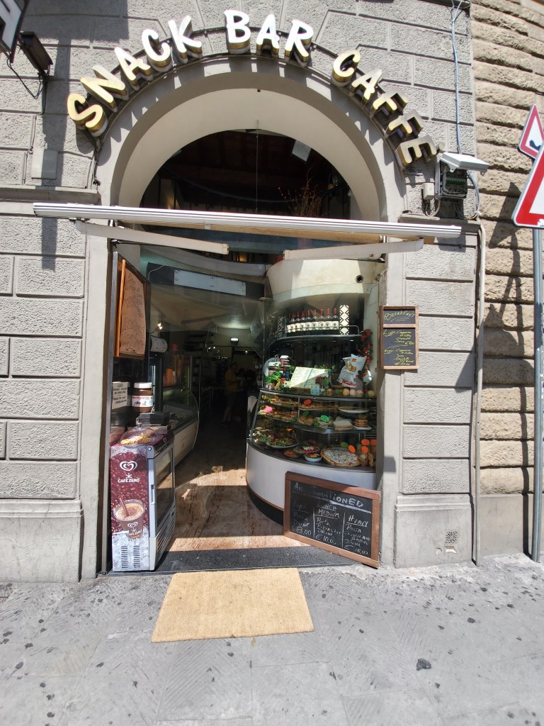 Now I bring to you another delightful Florentine friendship experience in August 2019 while visiting Caffe Corsini, also known as the “Snack Bar Caffe.” This nice little eatery was a pleasant break during my shopping experience in one of the most “touristy” places in Florence. It seemed always hot and crowded not far from the Duomo and Giatto’s Tower area and many different shops, gelatarerias, and restaurants lined the surrounding streets. Caffe’ Corsini became my favorite place to relax and eat my gelato while watching the tourist crowds go by. I am sorry to say that I never asked for the name of the two employees who always recognized me with a friendly greeting at the counter which was filled with an amazing selection of colorful foods. The two pleasant people who worked there were always so busy that I was afraid to interrupt them….. except this year, I took the liberty of obtaining quite a few photos with my cell phone! Also, I was able to talk briefly with a new employee who delivered my “snack”to my table upstairs. He spoke English fluently as well as Italian. It seemed funny to me that I never consumed soda in the United States. However, for some strange reason, while in Florence my taste buds liked the combination of Coke and gelato together! I have faith that soon I will return to Caffe Corsini and raise my Coke Zero in a “salute” to my dear friends.