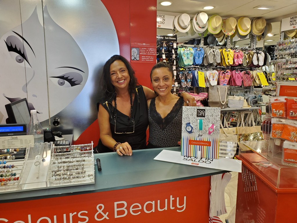 Friendly and a bit shy, Raffaela tried to hide from my cell phone camera in the “Accessorize” store, which I have visited for the past 4 years. This store is easy to find and always has a lot of good sales on jewelry and other fashionable items for your wardrobe! During this visit, I was searching for a small leather backpack to bring home to my daughter. I found the perfect size in black just at a reasonable cost. For the past two years I had recognized two employees but did not see them this year. I introduced myself to a shy young woman stationed behind the register counter. She listened attentively as I explained in Italian who I was looking for, one of which had a beautiful detailed tattoo of a rose on her arm. I showed Raffaela photos on my phone and she told me the two employees were off that day. At first, she tried to duck behind the counter to avoid having her photo taken. But, after my insistence and words of encouragement, she kindly obliged. Thank you Raffaela!