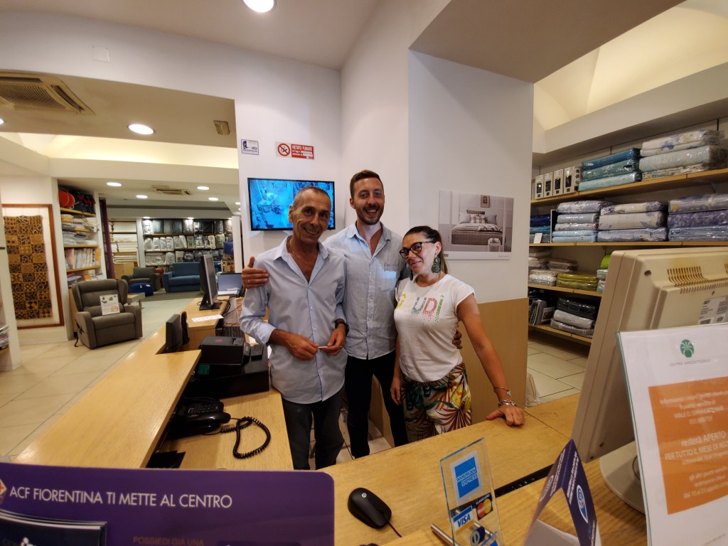 Towels? Who buys them while on vacation? Me, of course! In my apartment everything was wonderful, however, I only wanted a softer towel. Therefore, during one of my leisurely strolls, on a nice warm sunny day in Florence, I decided to try a quaint store with towels and many other types of linens. I introduced myself in Italian to an amicable trio of grinning sales associates and asked them to pose for a photo. The men struck a pose right away. However, the woman tried to escape and hide in another aisle! My coaxing words (Tu sei bella! Ma dai! – You are beautiful! Come on!) led her back to join the others in a lovely photo.