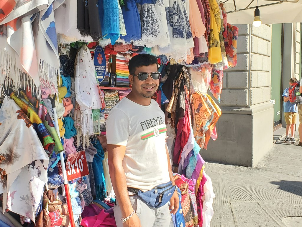 This vendor seemed to really enjoy what he was doing! A great big smile for all who passed in one of many crowded areas of central Florence. Uddin was very patient and kind while I chose a beautiful orange scarf to give to my daughter! (I enjoy spoiling my family!) I hope one day soon to see these vendors again. I loved seeing all the varieties of souvenirs and talking with the sellers. Many came from Morocco and Bangladesh and would tell me stories of their family backgrounds. Other vendors were natives of Florence and quite proud to have been doing their jobs for a long time. Now, during this difficult world pandemic, the streets are more subdued without the presence of vendors and tourists. I hope my vendor friends are safe and have found another way to financially support their families.